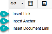 Allows the user to create a hyperlink from the selected text or object. Options for linking include: *Note: Due to a known issue, only option a: Insert Link is working in the Forms or Dedications Modules at this time. a: Insert Link (basic linking functions) |