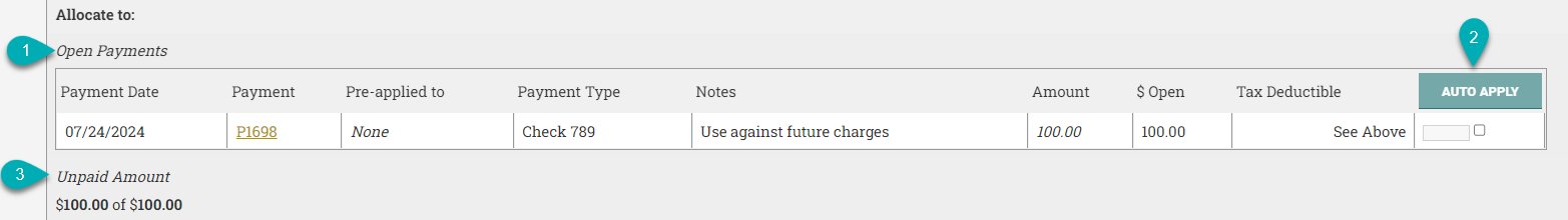 | 1. Open Payments | Any open payments on the account will be visible here. Use the checkbox to select the payment where the charge should be applied. |