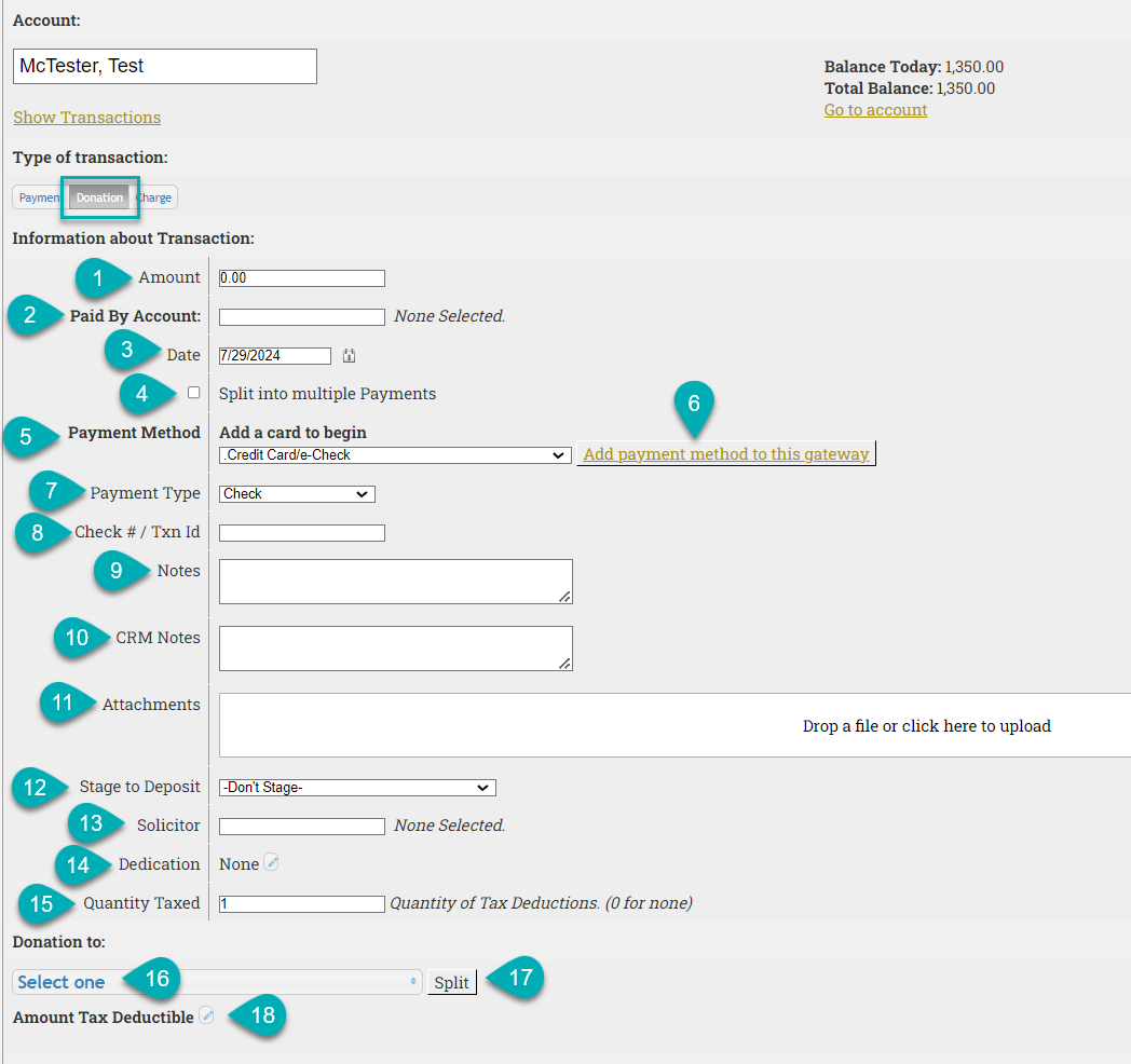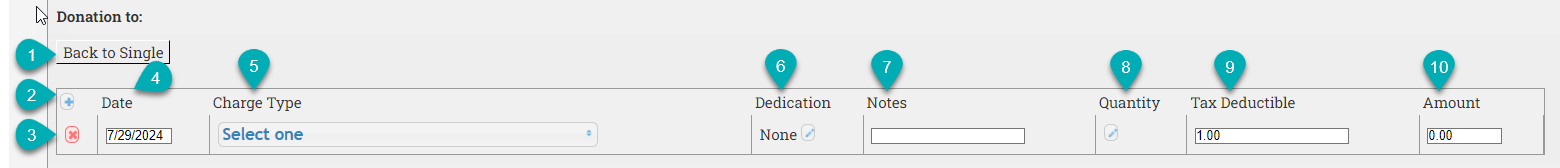 | 18. Amount Tax Deductible | Only visible when adding a donation. Edit the amount of the charge that is tax deductible, if different than the amount set in the charge type listing. |