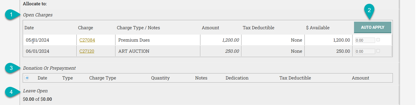 | 4. Leave Open | Shows the payment amount not allocated towards an open charge, donation, or prepayment. This is considered a credit on the account. |