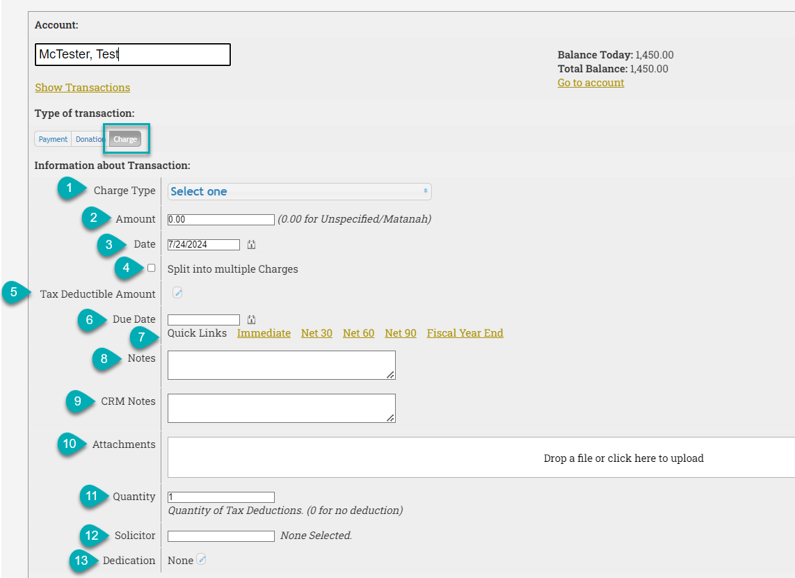 | 9. Tax Deductible | Edit the amount of the charge that is tax deductible, if different than the amount set in the charge type listing. |