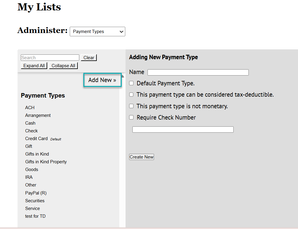 - Select Add New to create a new payment type
