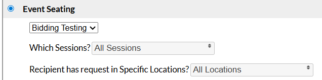 Sends mail based on submission status within the Event Seating module. Select which event with seating options to contact recipients for including sessions and specific locations. |