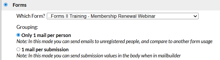 | 8. Forms | Sends mail to individuals who submitted a specific form. Select a form to target submitters from a dropdown. Form submission data cannot be accessed for specific merge fields in an email. Only one form can be selected at a time. |