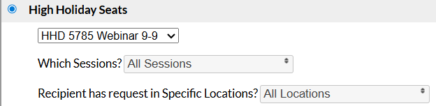 Sends communications based on High Holiday seating assignments. Select between an event, which session and if a specific location has been selected. |