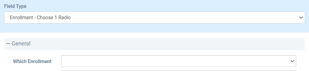 - In the Field Type dropdown, select a field from the Enrollment section. If an enrollment costs money, Enrollment Payment field types become available and all for a charge type to be assigned to the field.
