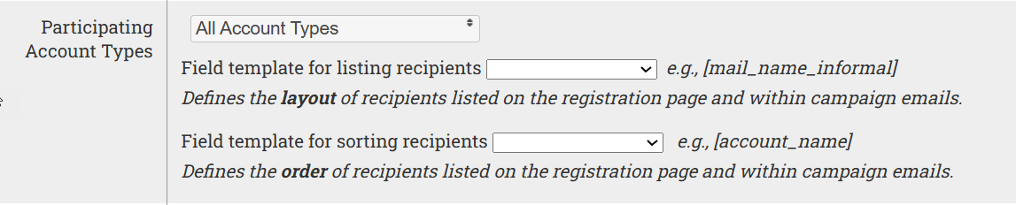 | Field template for listing recipients | Choose how names should be listed in communications to participants about the campaign. |