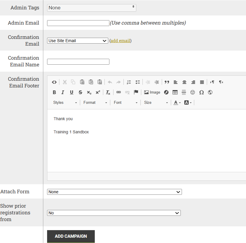 | Confirmation Email Footer | The content to show in the confirmation email, below the registration information. |