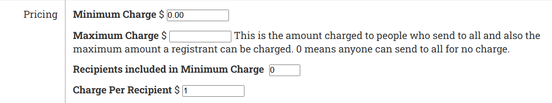 | Recipients included in Minimum Charge | The number of recipients included for the minimum charge. If the minimum is 2 people, the registrant would be able to send to two people for the minimum price. |