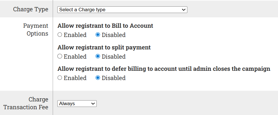 Charge Type & Payment Options - determine the charge type payments for the campaign should be applied to.
