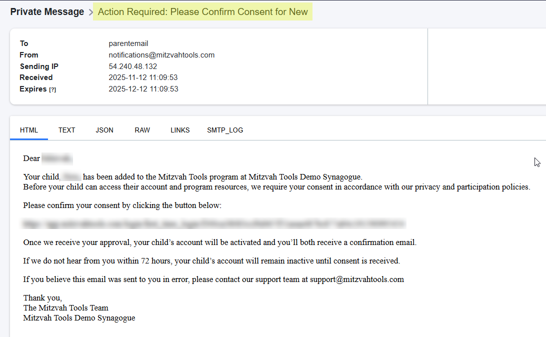 When a Program Manager selects Activate, the parent will receive an email to create their own password and then provide consent for their student the be added to Mitzvah Tools.